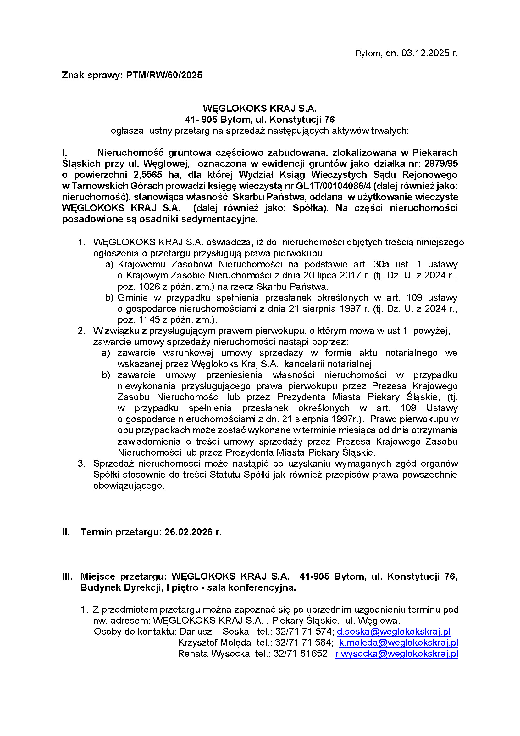 Przetarg PTM/RW/60/2025 na sprzedaż działki nr 2879/95
